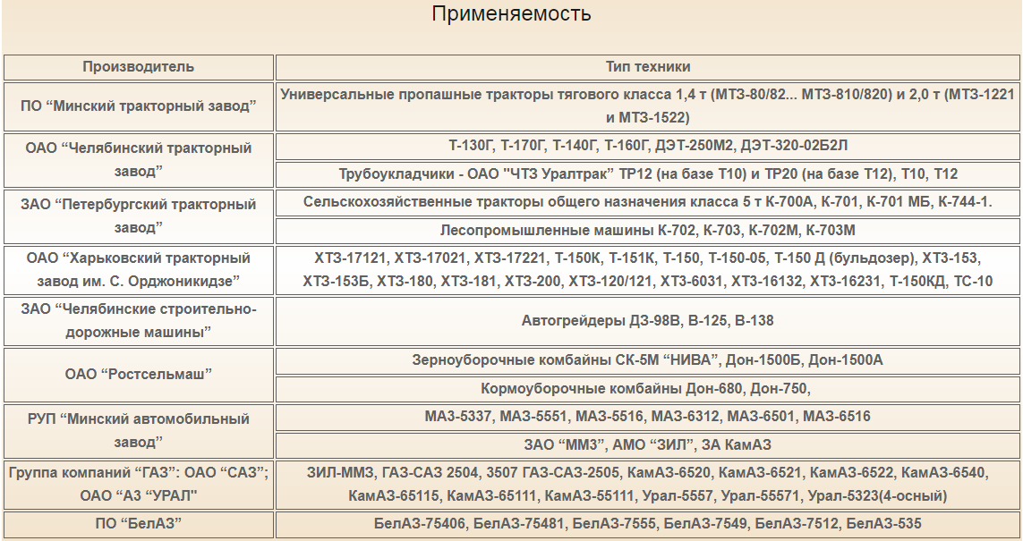 Применяются на бульдозерах, автогрейдерах, карьерных самосвалах, тракторах, комбайнах и другой мобильной технике.