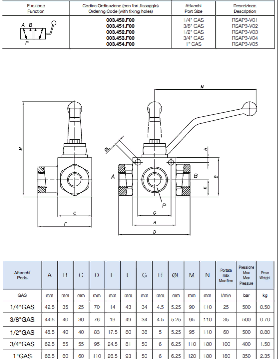 Краны RSAP3 используются для направления потока рабочей жидкости в два различных порта. В промежуточном положении все линии закрыты (схема с закрытым центром “L"). В отличие от диверторов, краны имеют шаровой запорный элемент, обеспечивающий высокую герметичность.