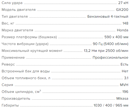 Реверсивная вибрационная плита Mikasa MVH-158GH - модель с бензиновым двигателем Honda, силой удара 27 кН и частотой 5400 ударов в минуту. Благодаря тому, что машина может двигаться как вперед, так и назад, она идеально подходит для работы в условиях, где невозможно развернуться (например, в траншеях или при проведении фундаментных работ).