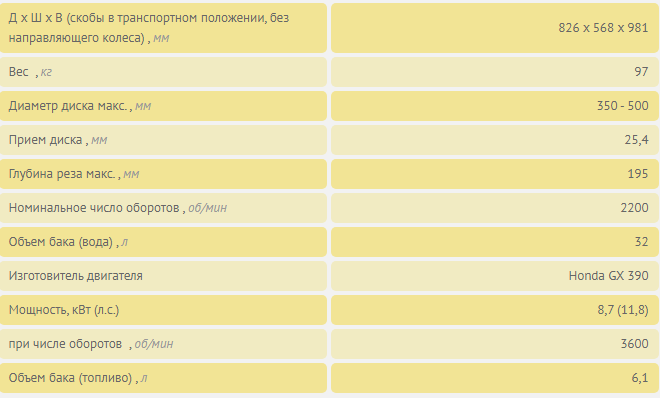 - При установке диска 500 мм шоврезчик способен эффективно резать асфальт или бетон на глубину до 195 мм