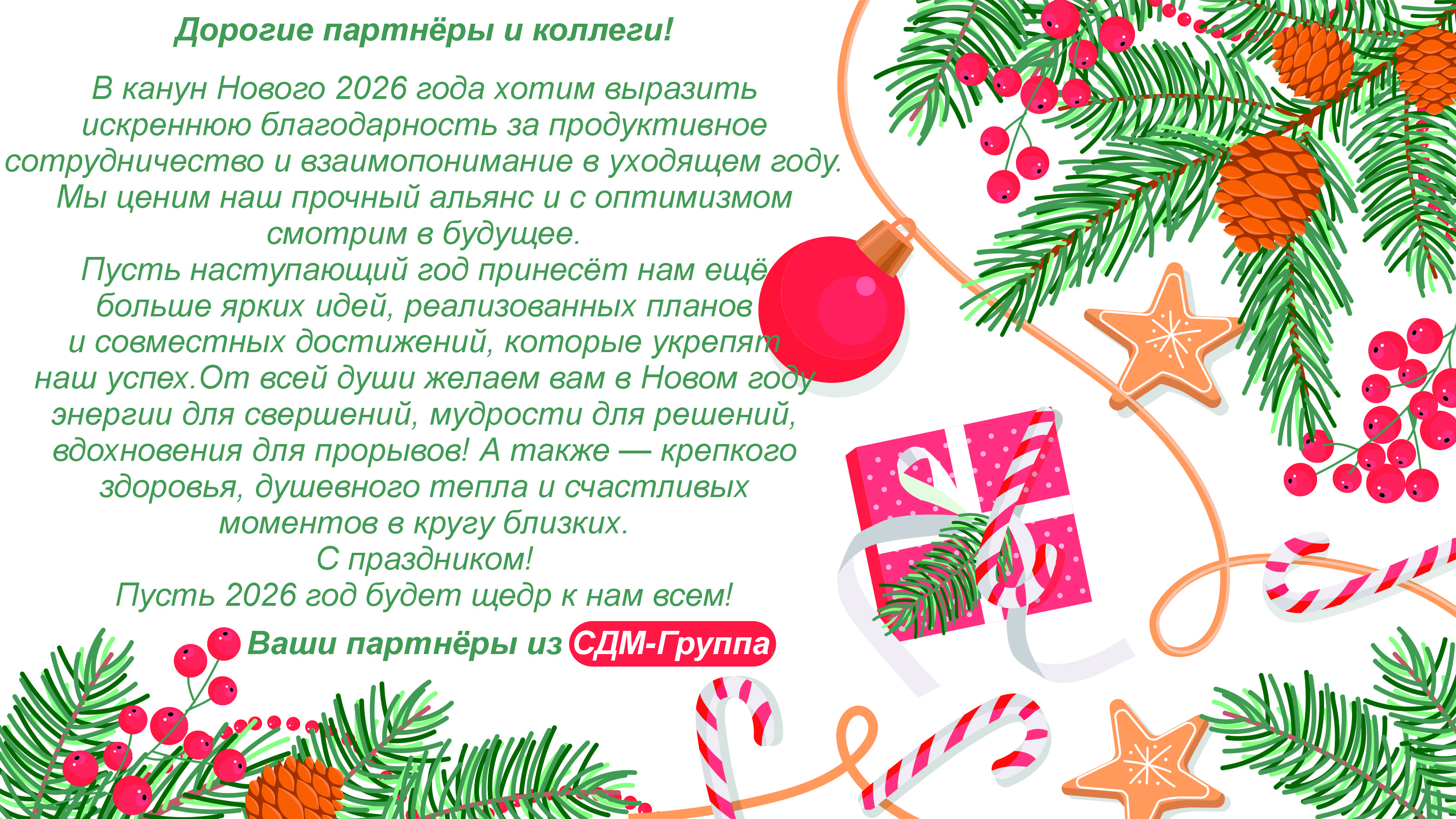 В канун Нового 2026 года хотим выразить искреннюю благодарность за продуктивное сотрудничество и взаимопонимание в уходящем году.